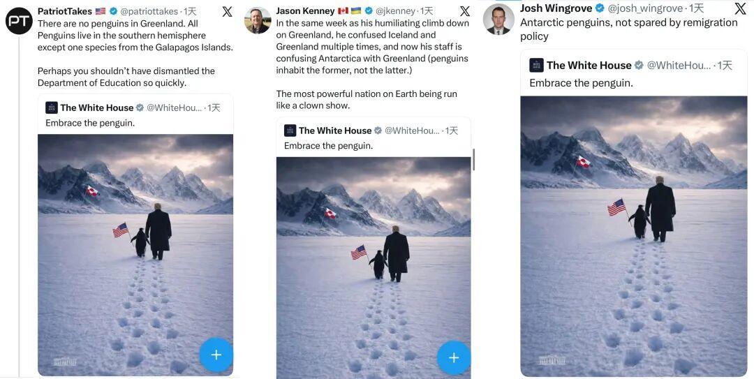 拥有46万多粉丝的X账号“Patriot Takes”回应道:“格陵兰岛没有企鹅……也许你不应该这么快就解散教育部。”