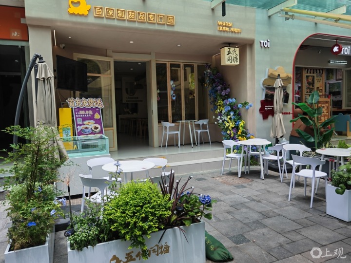 去年6月开业的开吉茶馆上生·新所店,店外有9张固定外摆位和3张动态外摆位,无论是晴好天气还是小雨时节,坐在树荫下的竹桌竹凳前喝着茶、品尝小茶点,都别有一番风味。开吉茶馆市场负责人表示,外摆位空间充分打开对餐饮商户的经营非常重要。该店目前面积约170平方米,外摆位面积占比1/5,但贡献了约1/3的营业额,“很多客人尤其是对中式茶饮好奇的外国客人来店里,都会选择外摆位,一边休闲一边看沿街风景。”