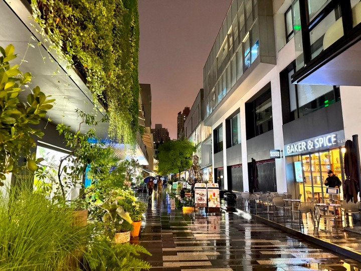 距离上生·新所不远的幸福里紧邻番禺路、幸福路两侧的居民区。园区一层的Bakerspice、南洋记、乾璟荟等10余家餐饮商户均设置了风格不同的外摆位,有的用绿植花卉作为自然隔断,有的则直接与园区主干道相互融合。每到夜间10时左右,这里的餐饮商户几乎都结束经营,并且园区夜间照明均采用柔和灯光,各家餐厅的门头招牌也对光源柔和度有一定要求,降低对周边居民区的影响。