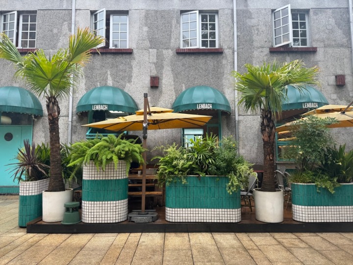 在长宁区上生·新所,兰巴赫也有一家店,位于海军俱乐部内,围绕标志性的泳池在一、二层设有5家风格各异的餐厅,共计有44张外摆位。其中,采用“Tiffany蓝”配色的西餐厅兰巴赫POOLSIDE有60%的经营面积都留给了外摆位。